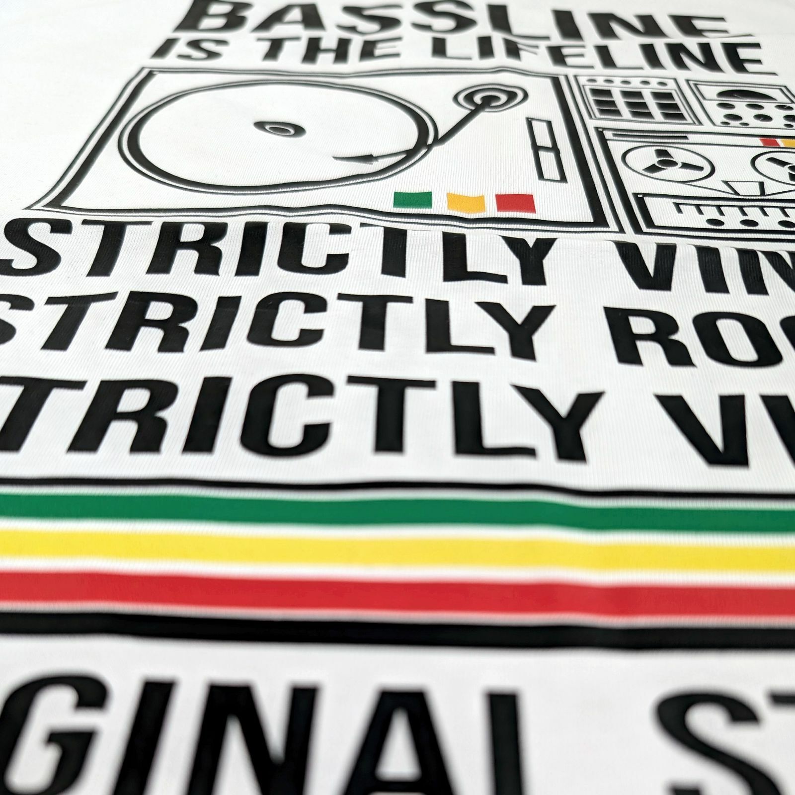 Design: Features a clean, bold graphic of a turntable, mixer, and tape deck, with classic Reggae-inspired colors. This tee is a tribute to strictly vinyl, strictly roots, strictly vibes – the pure old-school Reggae sound.