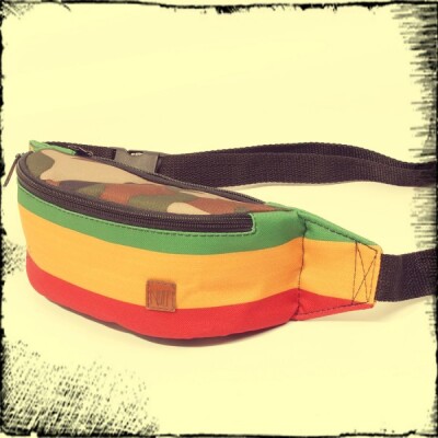 Front i tył saszetki utrzymany w kolorach reggae, góra i dół w militarnym klimacie kamuflażu woodland.